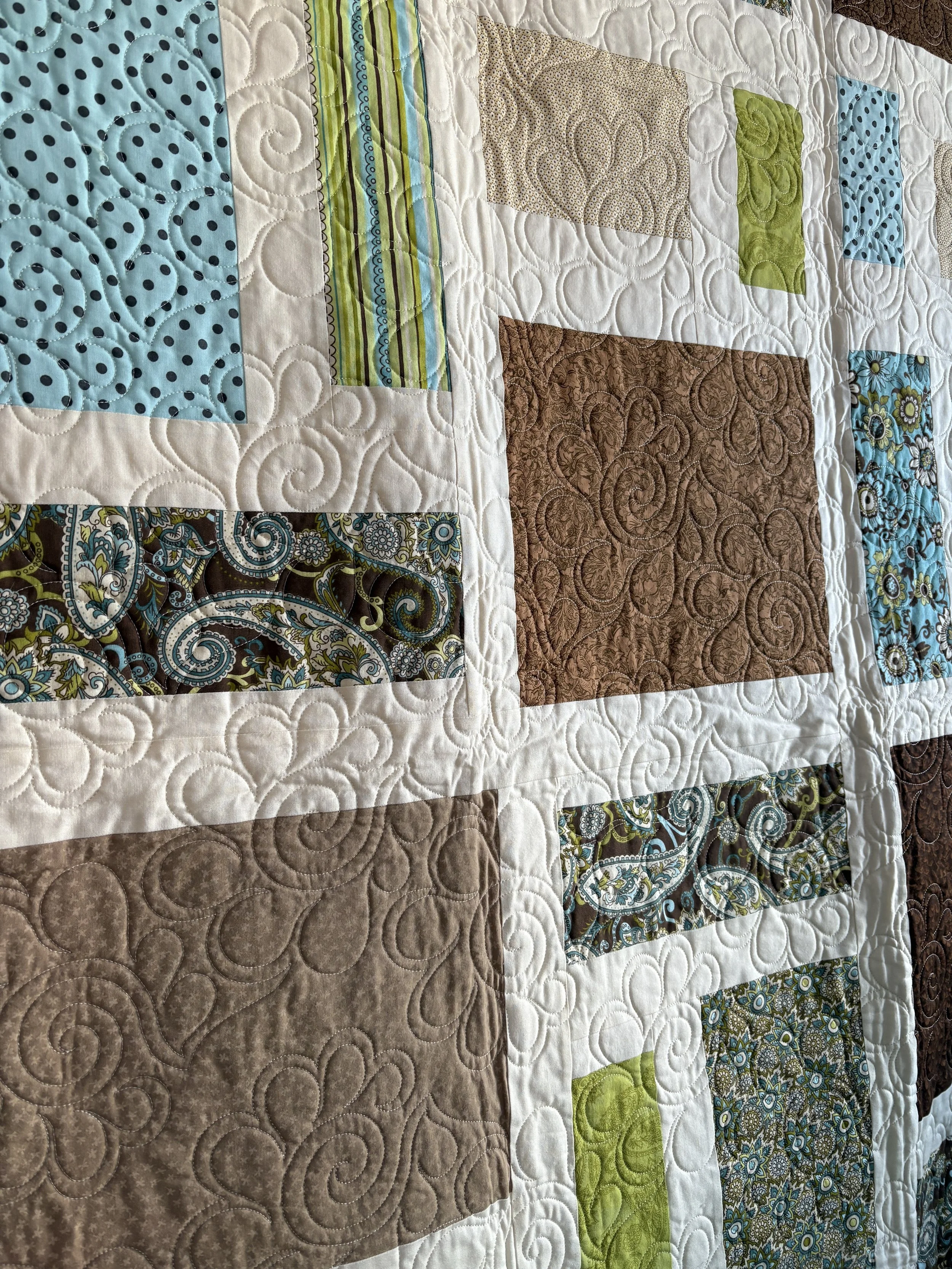 Edge to edge quilting at 2.5 cents per square inch. Smaller, more dense patterns are 3.5 cents per square inch.